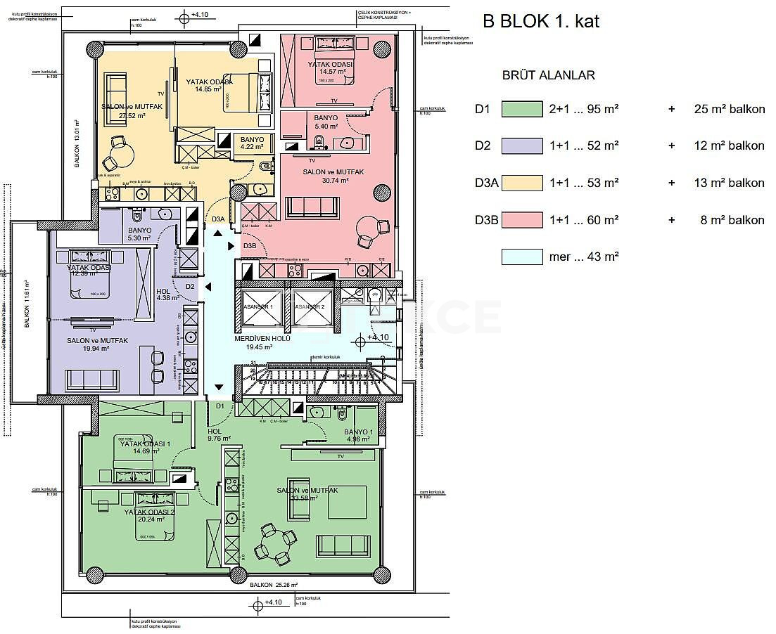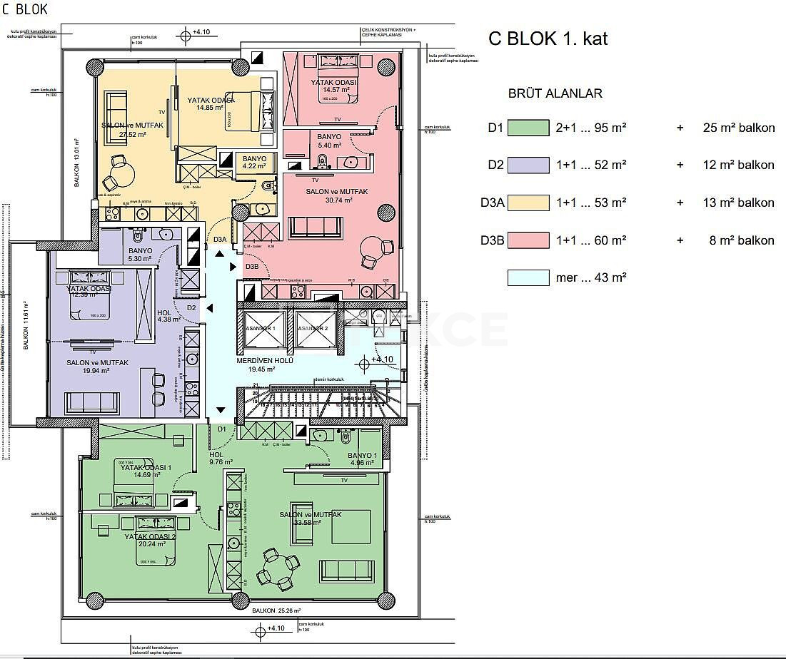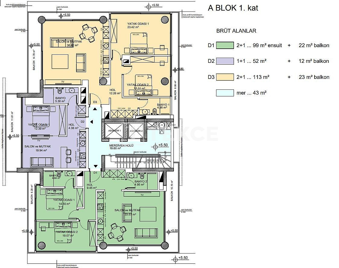 The mixed-used project stands out as an ideal option both for living and investment. Consisting of four blocks, it includes a total of 84 residences and 17 commercial units. The commercial spaces on the ground floor include restaurants, shops, and markets. Meanwhile, the apartments on the upper floors provide a comfortable city-center lifestyle. Also, spacious terraces offer the opportunity to enjoy sea views at sunset, creating a peaceful atmosphere. The project also includes amenities such as a gym, generator, parking area, and security system to enhance daily comfort.