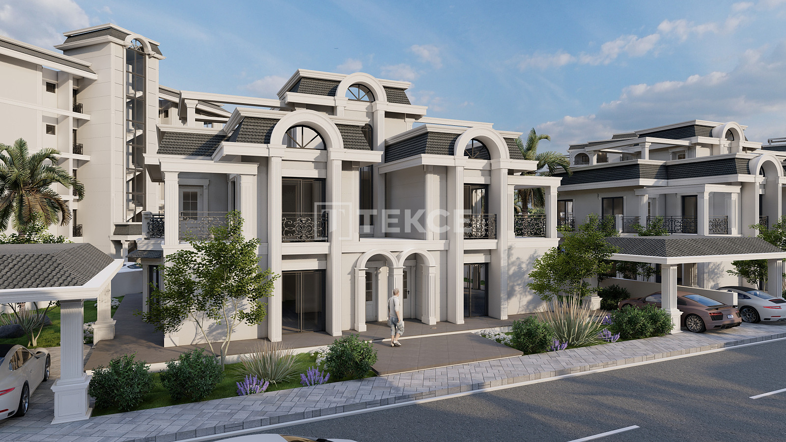 There are multiple apartment types in the complex. Each has open-plan kitchens, spacious living areas, generous balconies, and large windows. The ceramic coverings and functional kitchen add to the comfort.