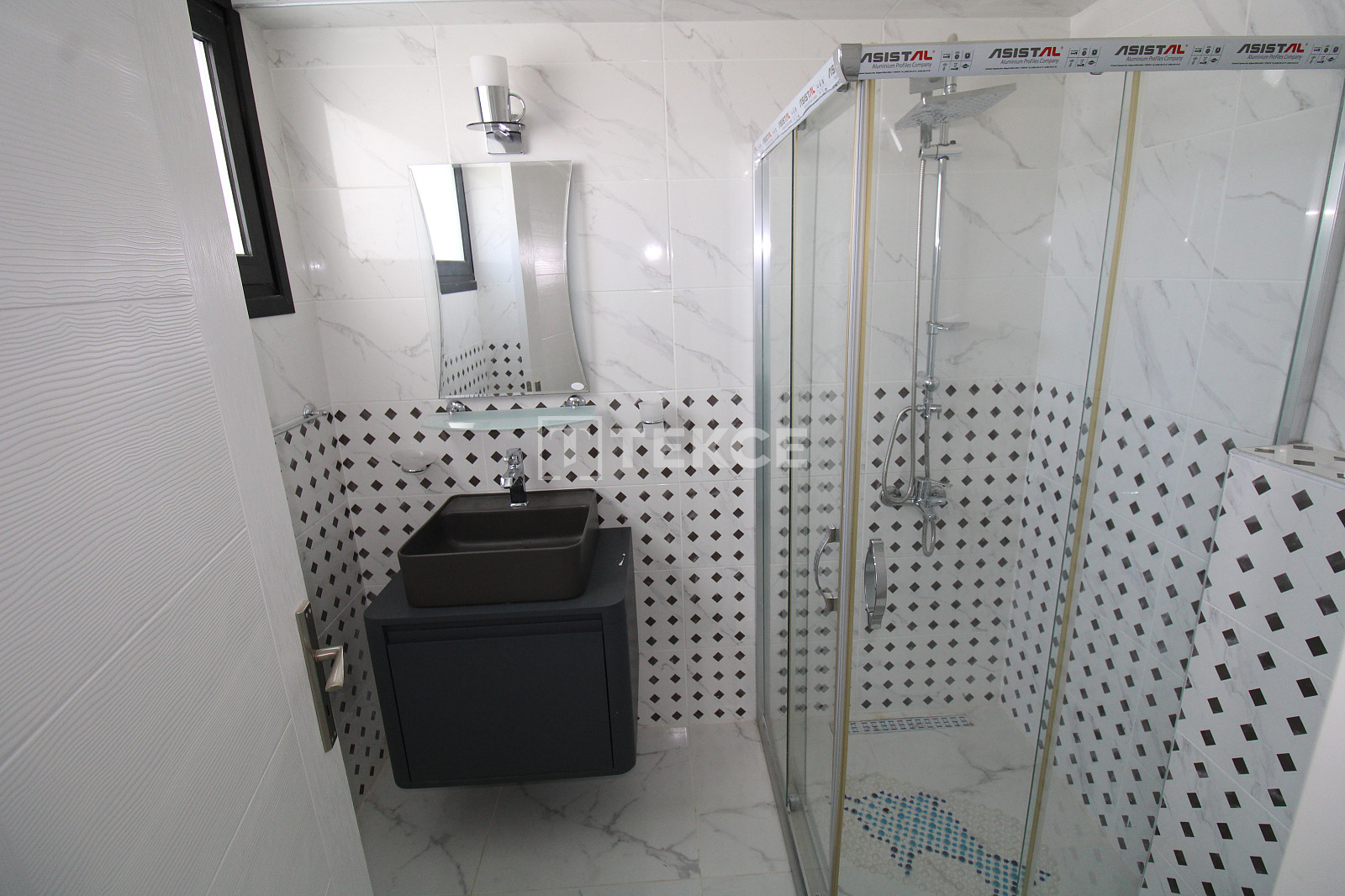 This unique 3-bedroom duplex villa features a spacious and bright living room, an open-plan kitchen, a guest bathroom, and a terrace-access sitting area on the ground floor. Upstairs, there are three bedrooms, two with en-suite bathrooms, a shared bathroom, and a large sea-view balcony. The villa’s outdoor area includes a 32 m² private swimming pool, a spacious garden, a parking space, and an outdoor lounge area. The large terrace is the perfect spot to enjoy the sunset. The villa also offers comfort-enhancing details such as air conditioning infrastructure, central internet and satellite systems, double-glazed windows, and high-quality ceramic finishes.