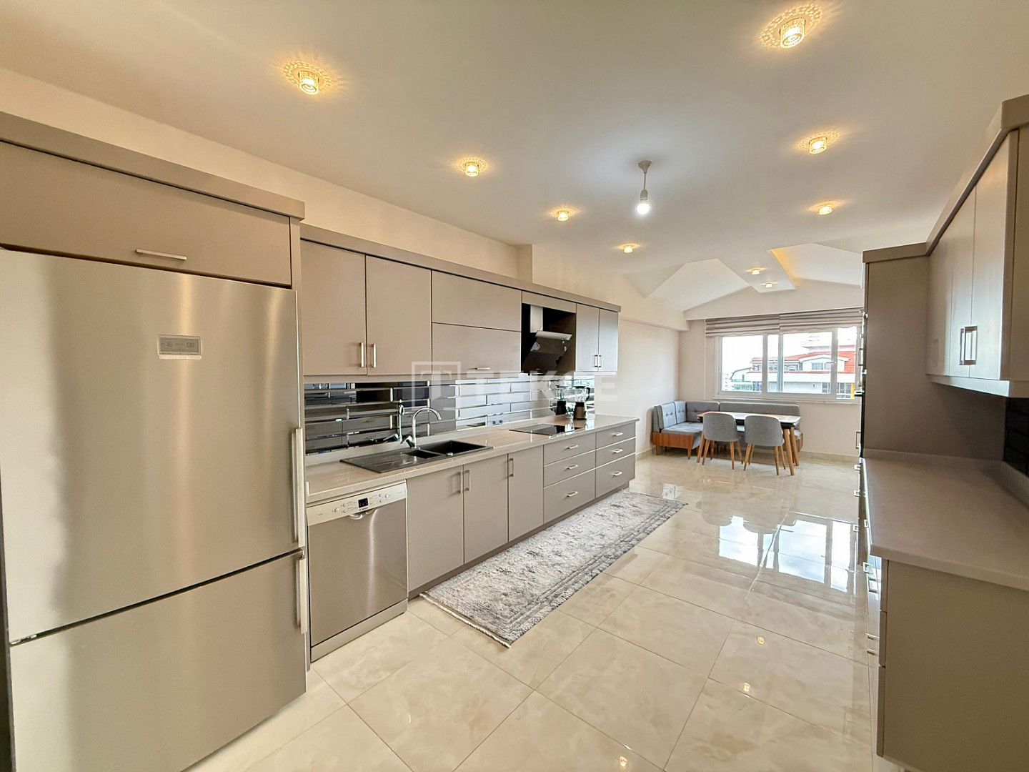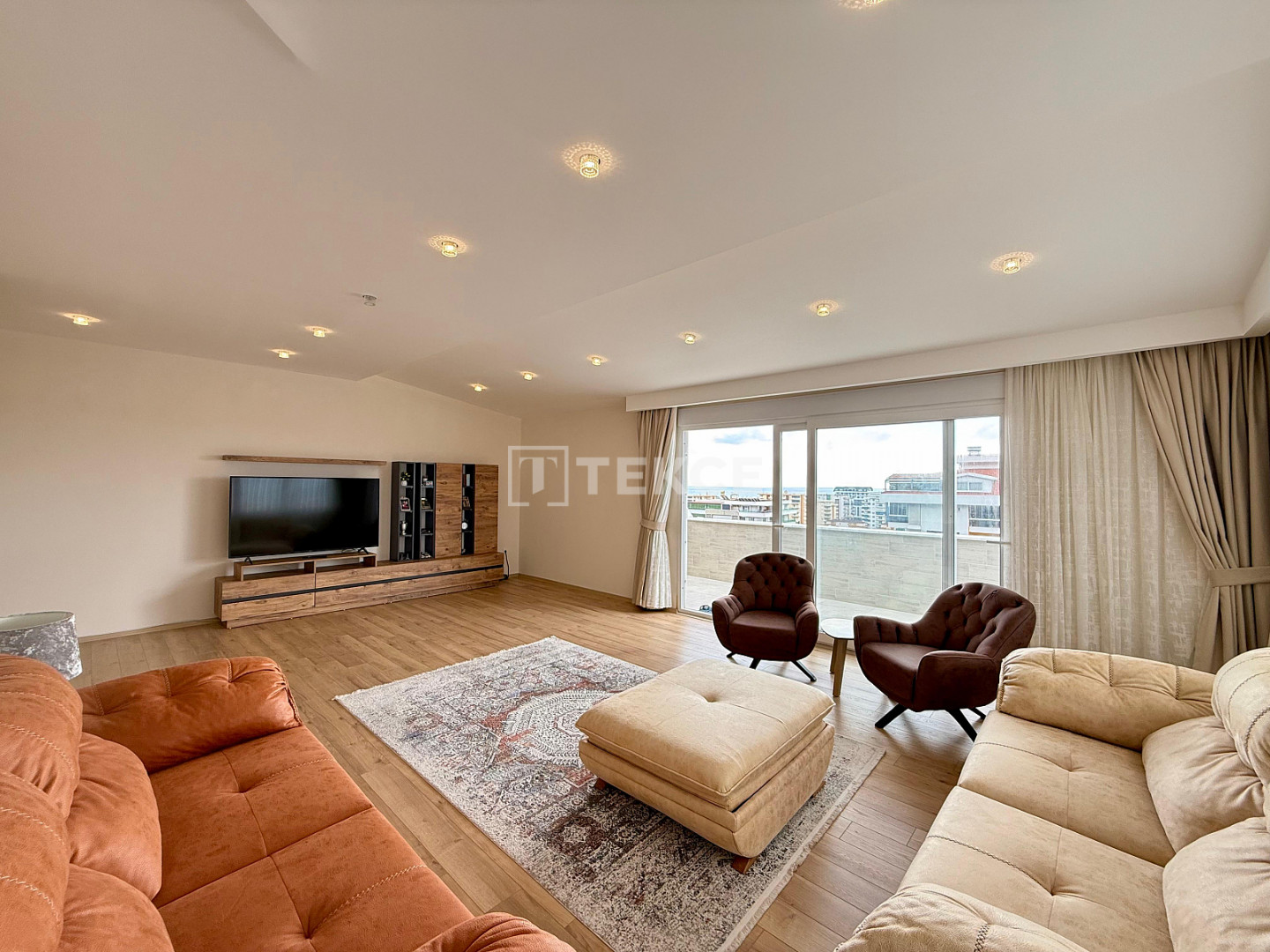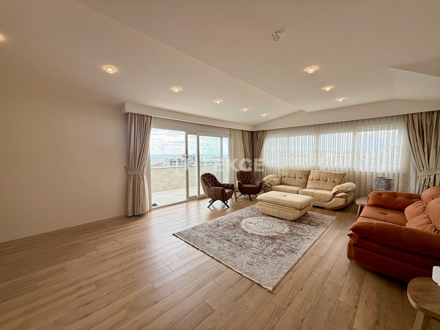 The 4-bedroom penthouse apartment is equipped with premium features such as a steel entrance door, double-glazed PVC windows, a fully tiled bathroom and kitchen with built-in cabinets, ceramic flooring, LED lighting, aluminum balcony railings, an intercom system, wireless internet, and a central satellite system. Designed with modern materials, the apartment comes fully equipped with high-quality Bosch appliances.