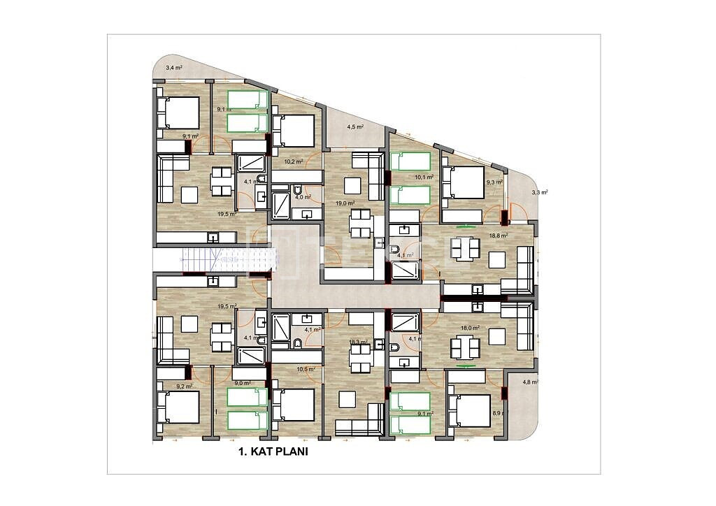 The flats consist of a bedroom, living room, open kitchen, bathroom, and balcony. They are equipped with lacquered kitchen cabinets, high-quality branded fixtures, aluminum-framed windows, air conditioning in the living room, wooden and ceramic flooring, shower cabins, steel front doors, and underfloor heating.