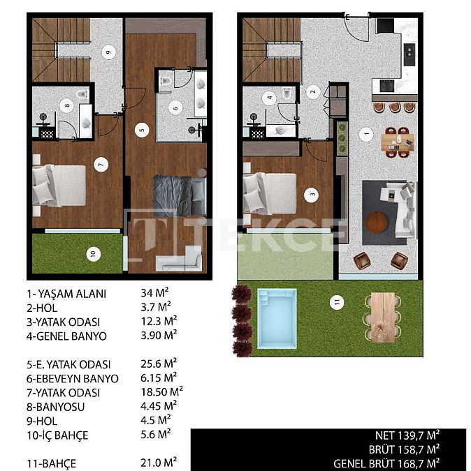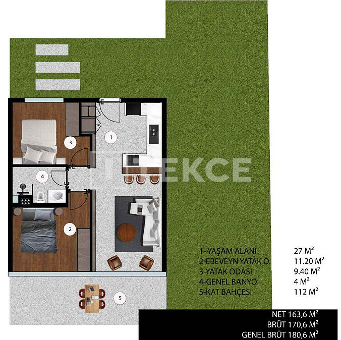 The project is built on a 1,480 m² land area and offers garden floor, duplex, and middle-floor apartments. Garden areas are assigned for private use by the garden floor units. The complex features amenities such as an open parking area, communal swimming pool, security cameras, and an elevator.