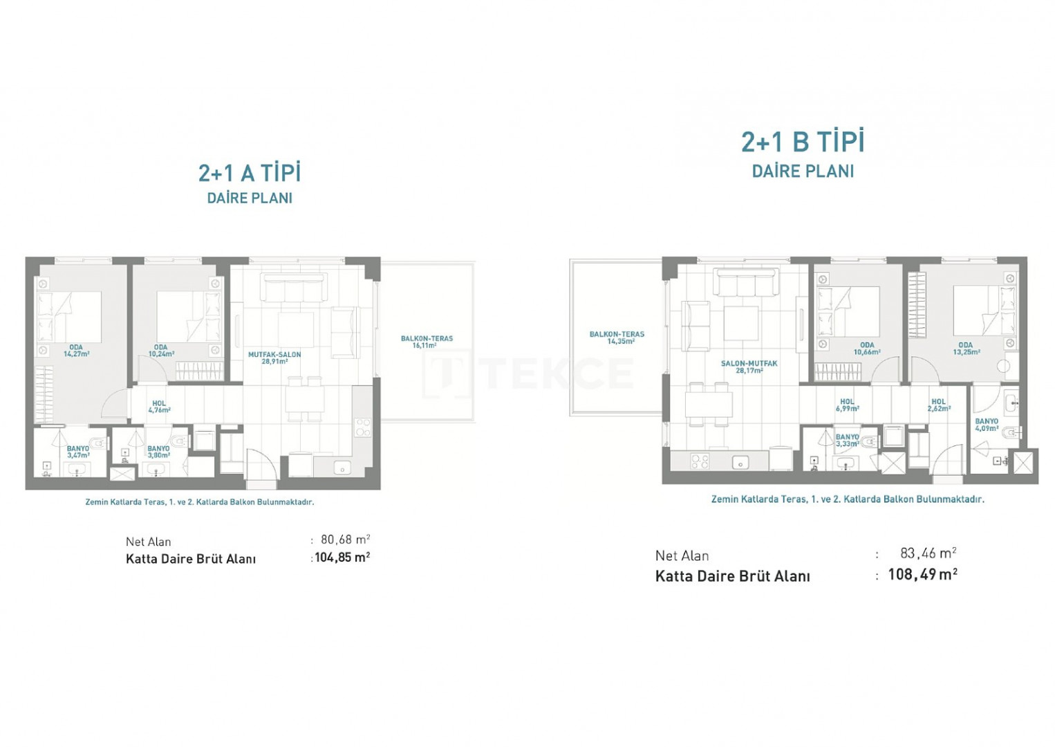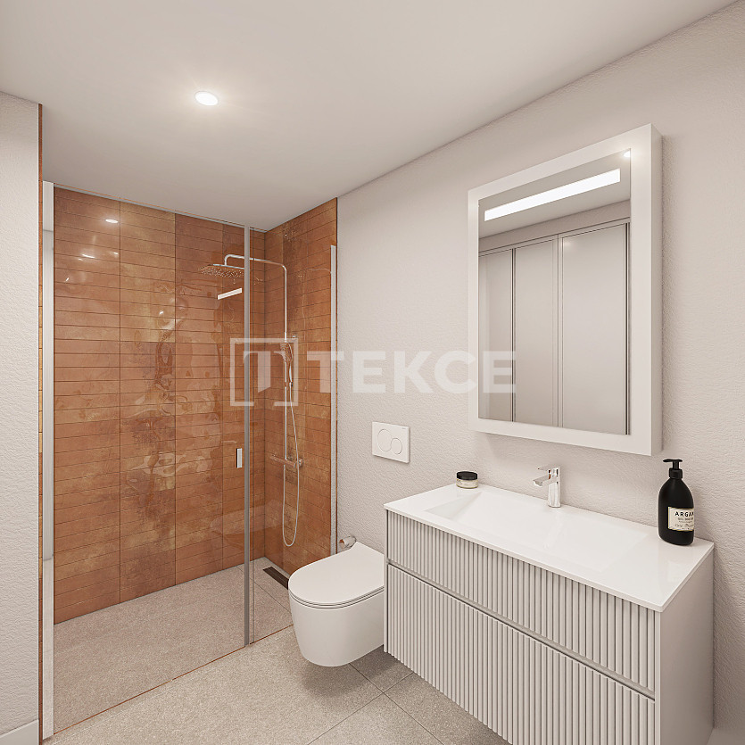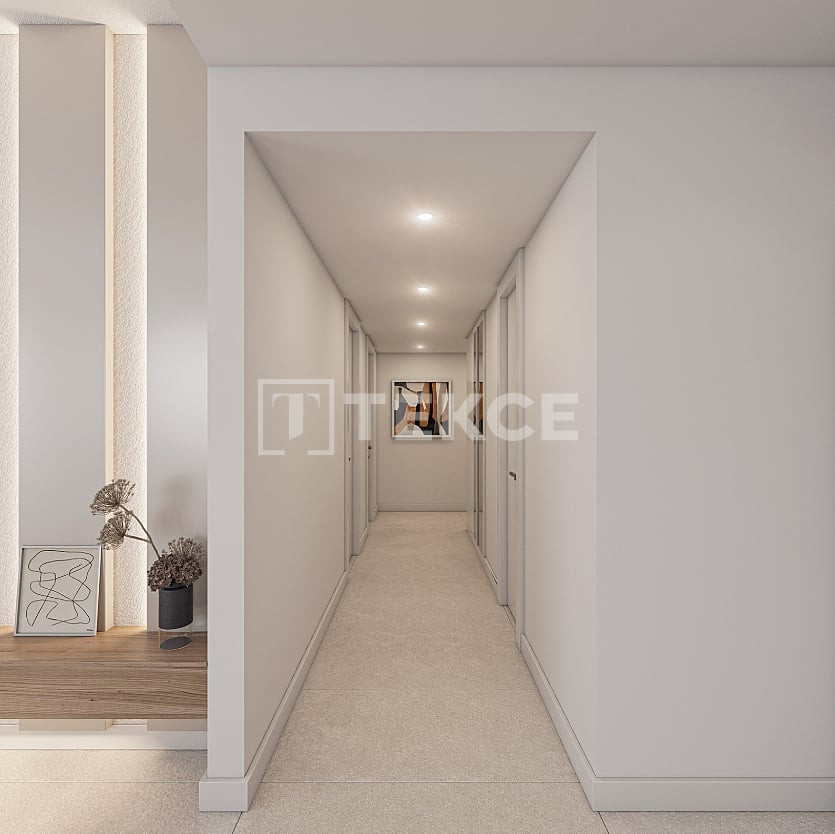 Apartments include living rooms, open kitchens, bedrooms, en-suite bathrooms, storage spaces, balconies or garden terraces. Interiors feature steel doors, aluminum-framed windows, double glazing, ceramic and laminate floors, lacquered kitchen cabinets and doors, smart home systems, and air conditioning for heating and cooling.