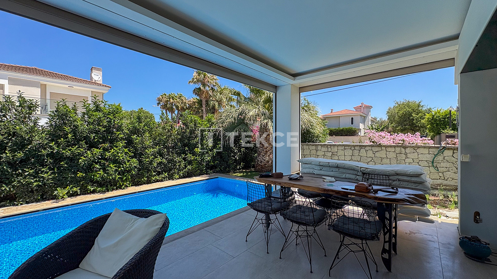 This detached villa is located in the Alaçatı neighborhood of Çeşme, İzmir’s popular holiday destination. Çeşme stands out as an exclusive area known for its tranquil atmosphere and high-quality lifestyle. Residents of Çeşme enjoy easy access to beaches, a variety of social activities, gourmet restaurants, natural spring waters, fishing, yachting, windsurfing, and many other outdoor sports all year round. Alaçatı is particularly notable for preserving its traditional architecture while also offering modern living conveniences. Attracting both local and international visitors in recent years, Alaçatı hosts the famous Alaçatı Herb Festival every spring, drawing nature and Aegean cuisine enthusiasts alike. Even in the off-season, the area maintains a peaceful, serene, and romantic charm.