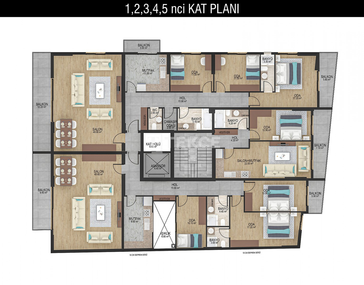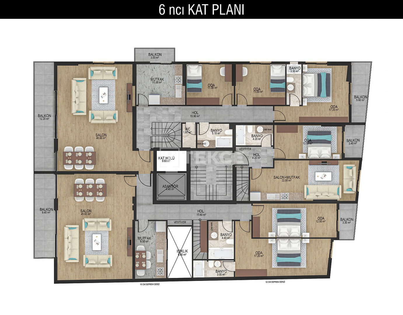 The apartments, available as duplexes and mid-floor units, include shared bathrooms, en-suite master bathrooms, closed kitchens equipped with built-in appliances, high-quality kitchen and bathroom cabinetry, air conditioning cooling systems, natural gas heating, steel entrance doors, premium ceramic and laminate flooring, and high-quality aluminum window systems, all offering luxurious and rich features.