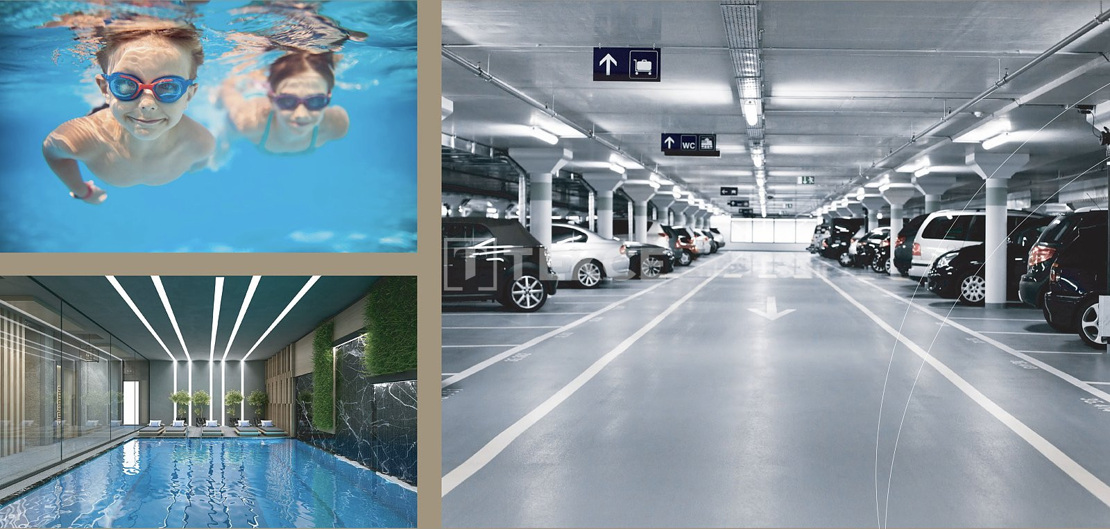 The 35-storey project features 357 apartments in total. Amenities include indoor and outdoor swimming pools, a lobby, reception, a gym, offices, cafeterias, a parking garage, a separate parking lot for guests, and a 24/7 security service. Security cameras and EV charging stations are also available.