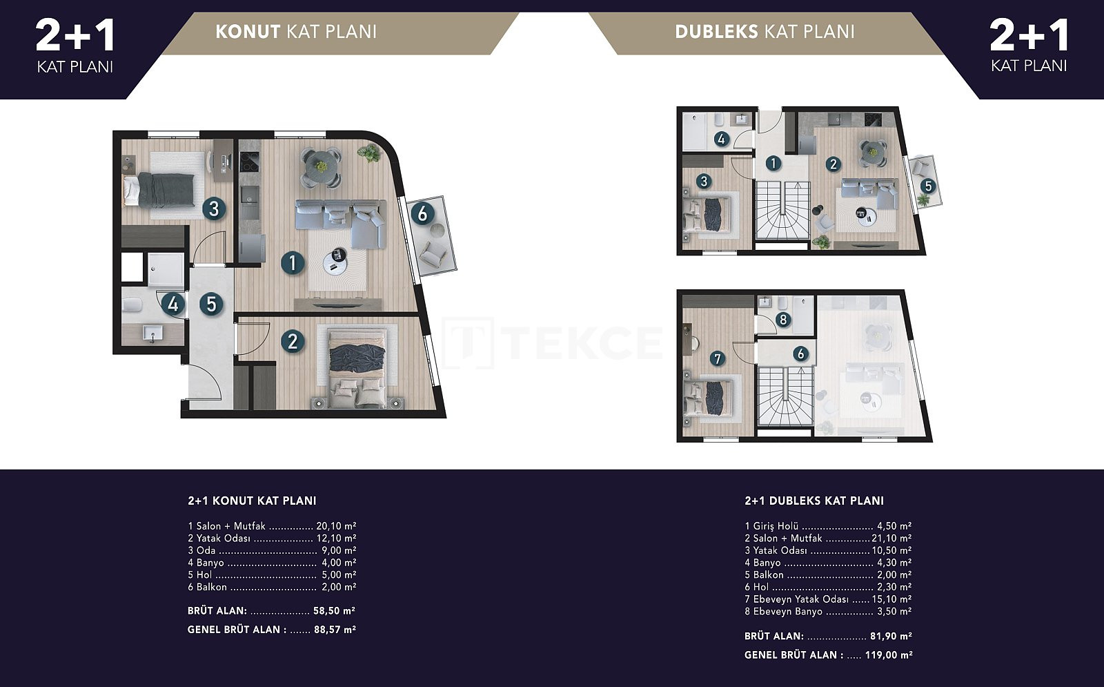 The apartments feature open-plan kitchens, balconies, and en-suite bathrooms. They are equipped with shower cabins, customized bathroom and kitchen cabinets, 4-piece built-in kitchen appliances, smart home technologies, VFR systems, aluminum windows, laminated parquets, and ceramic flooring.