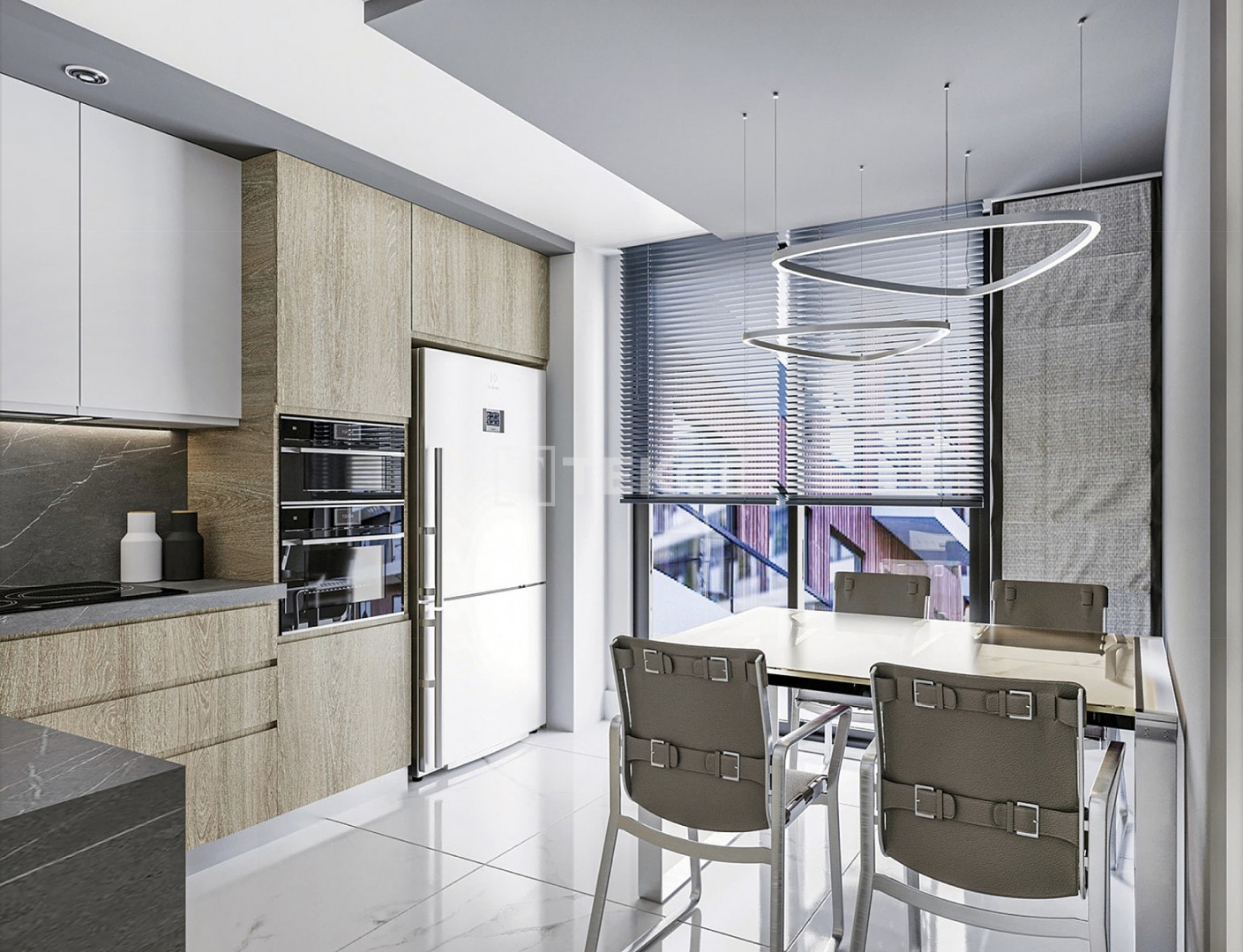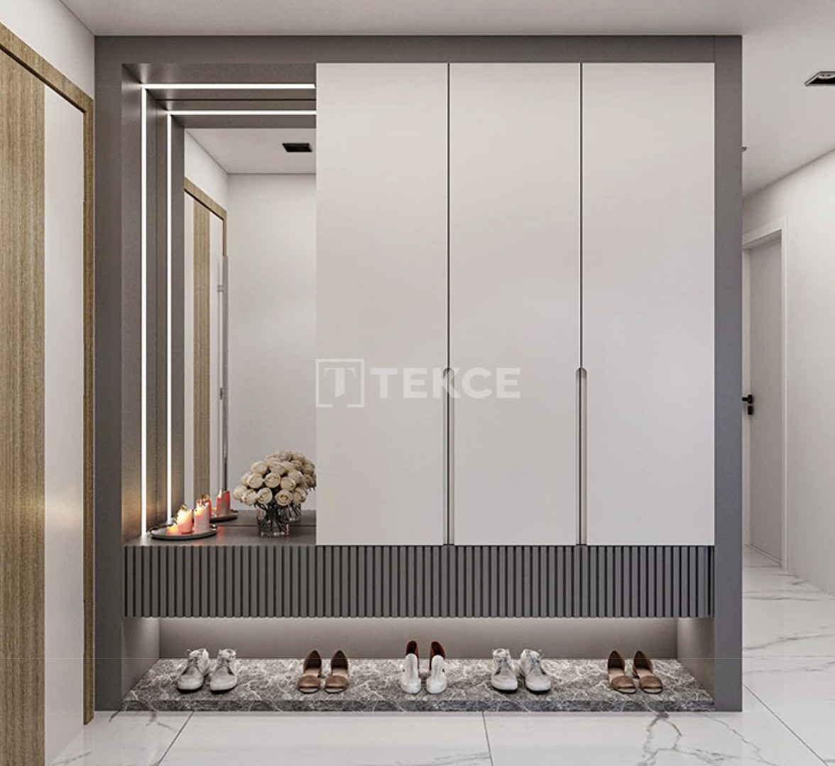 The apartments feature either open-plan or separate kitchens, depending on the layout. Each unit is equipped with a steel entry door, ceramic and laminate flooring, high-quality kitchen cabinets, built-in appliances, double-glazed windows, air conditioning infrastructure, and a video intercom system for added security and convenience.
