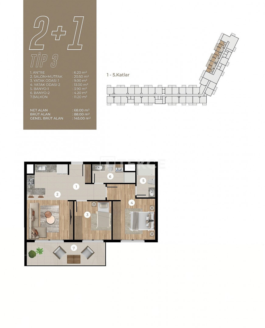 Apartments for sale in İzmir are situated 50 m from the bus stop, 100 m from the university, 300 m from the market, 500 m from the shopping centers and hospitals, 2 km from IKEA, 6 km from Alsancak and İzmir promenade, 30 km from Adnan Menderes Airport, and 50 km from beaches of Urla.
