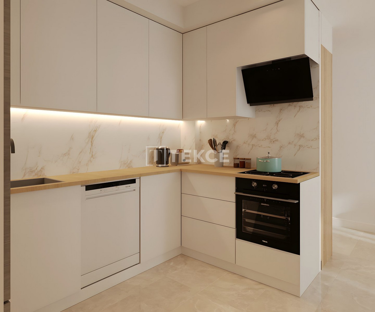 The apartments are equipped with open-plan kitchens, high-quality kitchen cabinets, built-in kitchen appliances, steel doors, coat racks, bathroom cabinets, ceramic and laminate flooring, PVC windows with heat glazing, smart home systems, underfloor heating, and air conditioning.