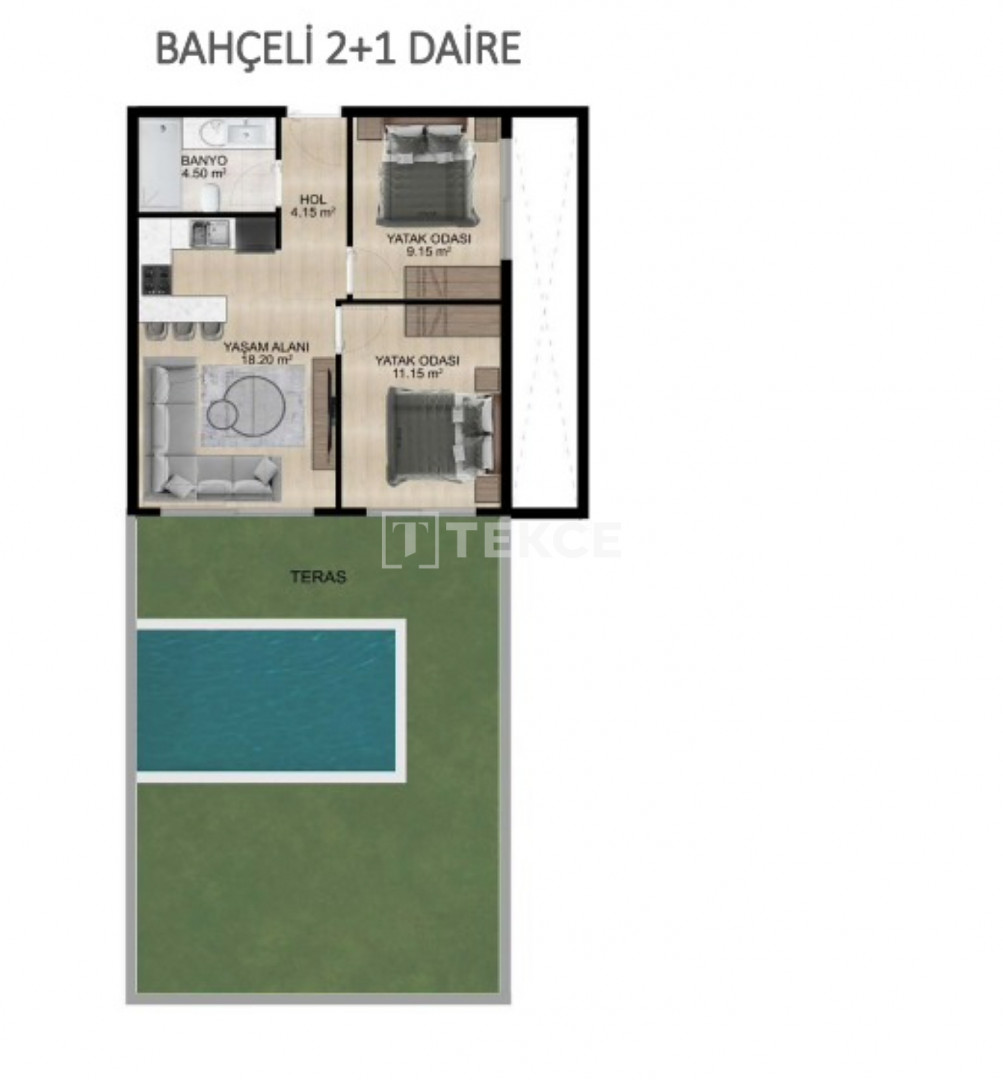 The flats in İzmir for sale come with open-plan kitchens, en-suite bathrooms, shower cabins, garden terraces, balconies, steel exterior doors, PVC window systems, ceramic and laminated floor coverings, lacquer-covered kitchen cabinets and interior doors, and heating & cooling via A/Cs.