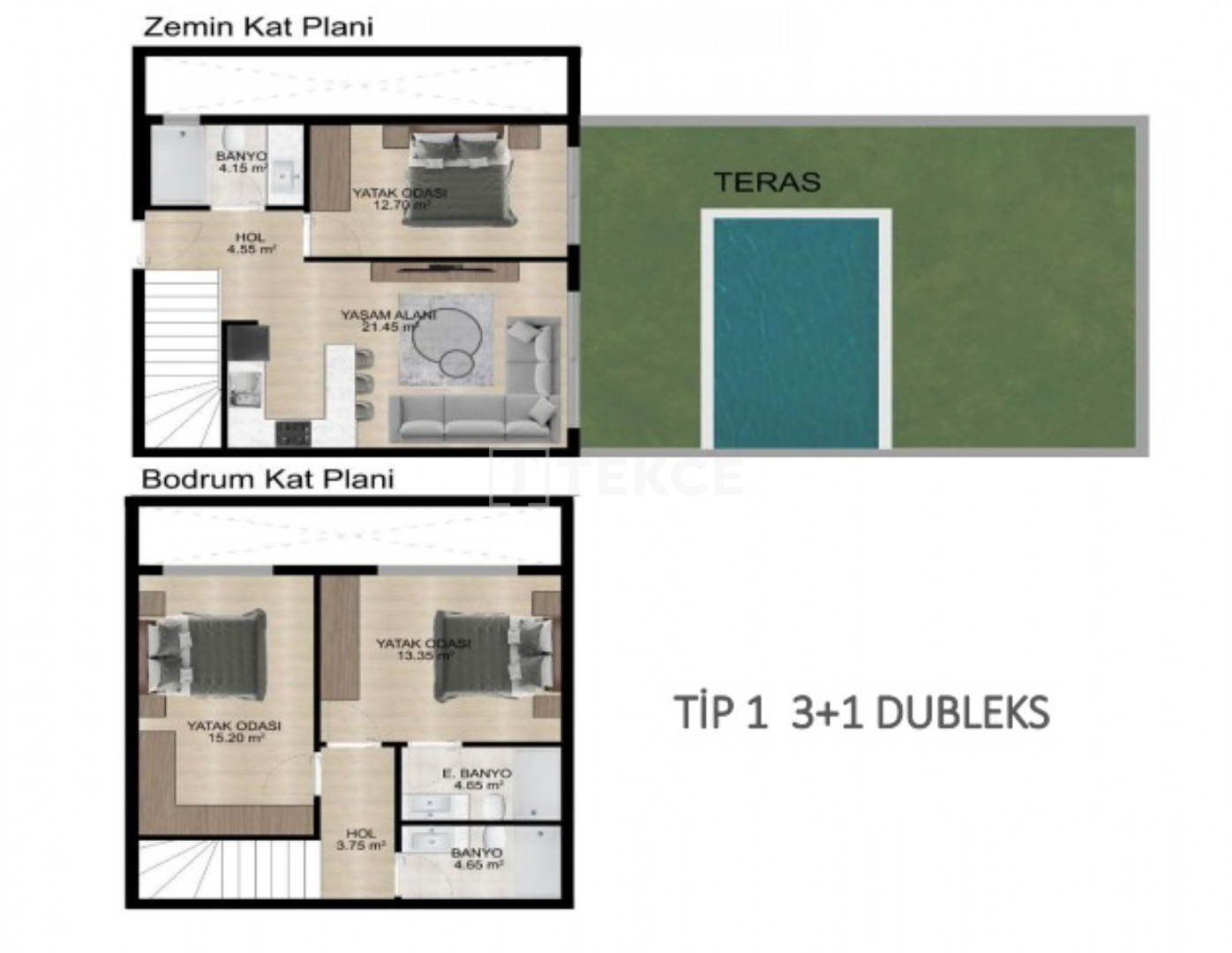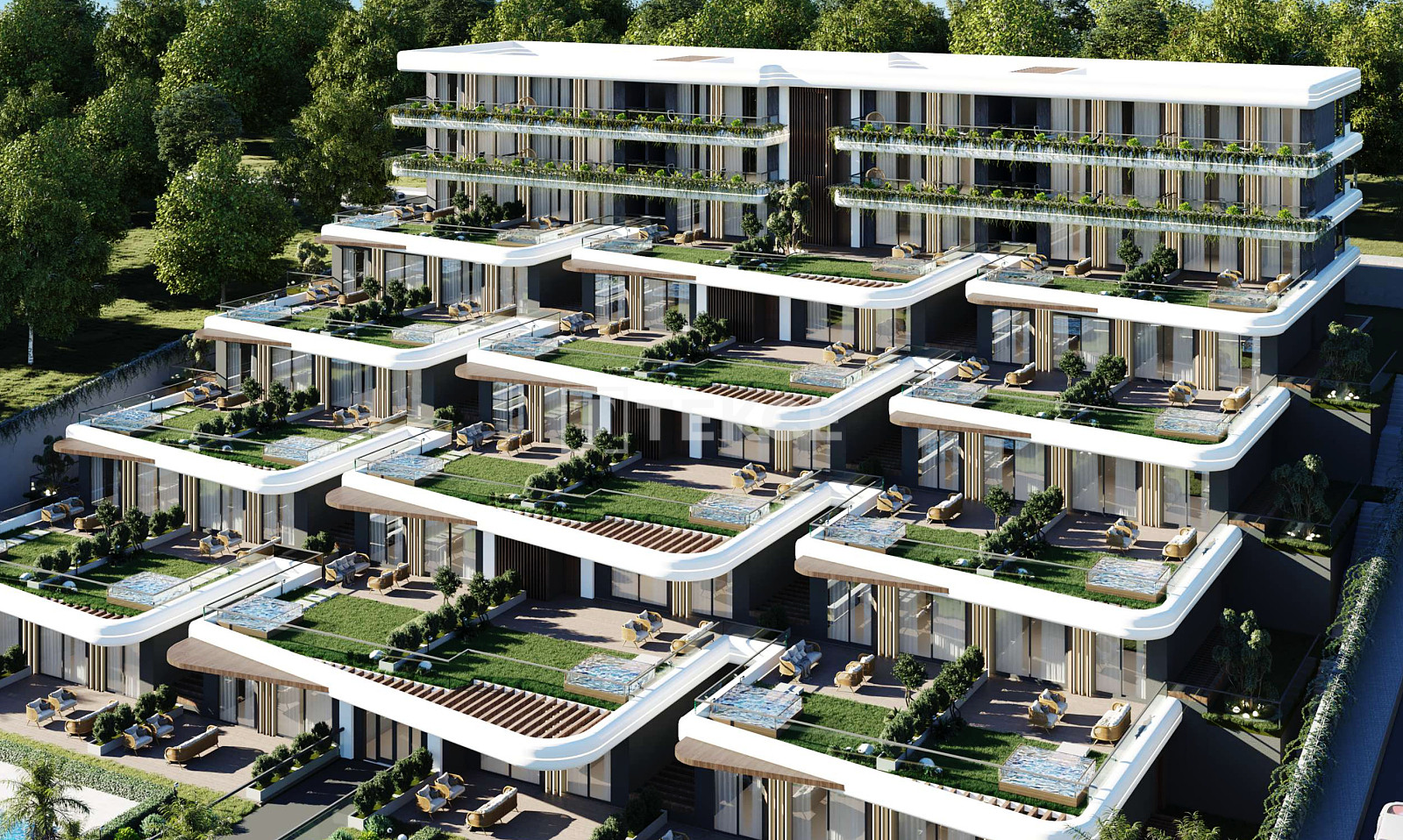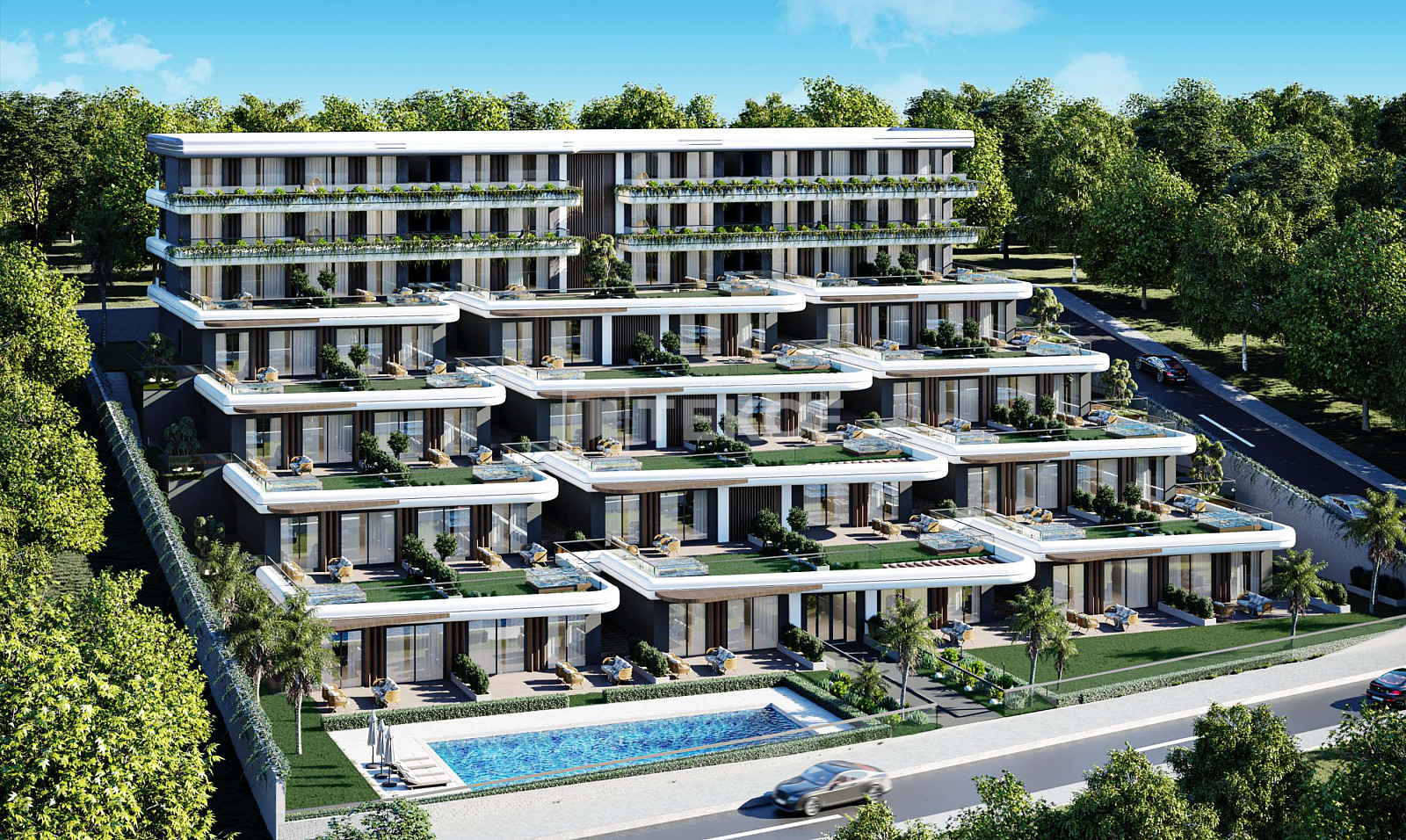 The project of flats with detached gardens is situated on 4.000 m² total plots. Here, there are indoor and outdoor parking, sports and activity grounds, a communal swimming pool, a generator, a water tank, 24/7 security service, and security cameras.
