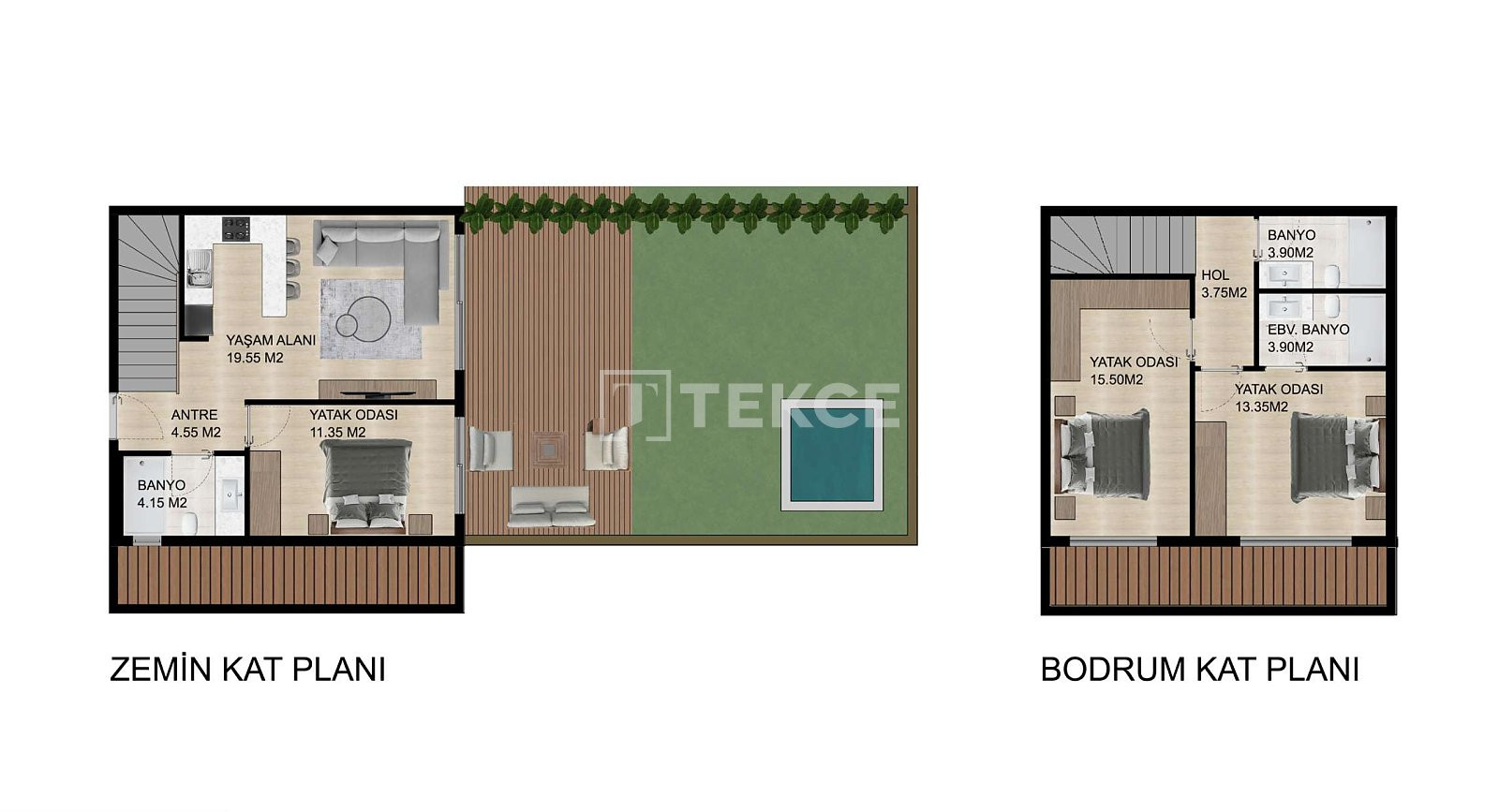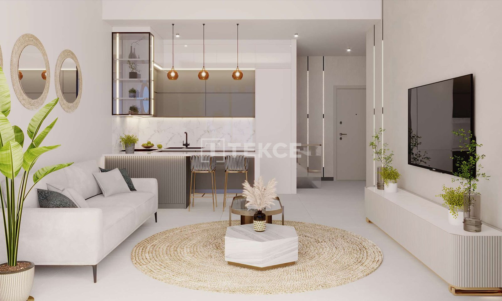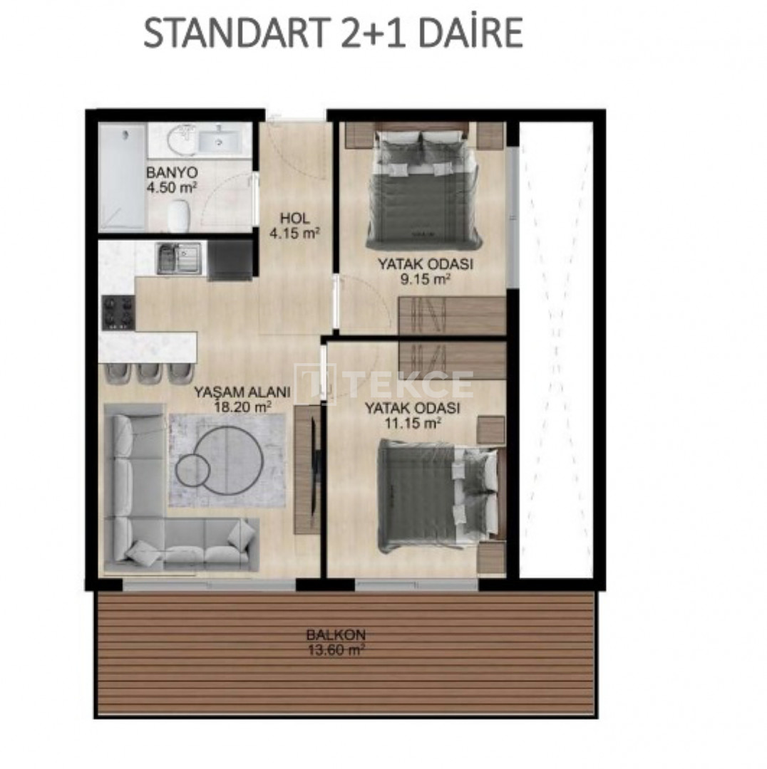 The flats in İzmir for sale come with open-plan kitchens, en-suite bathrooms, shower cabins, garden terraces, balconies, steel exterior doors, PVC window systems, ceramic and laminated floor coverings, lacquer-covered kitchen cabinets and interior doors, and heating & cooling via A/Cs.