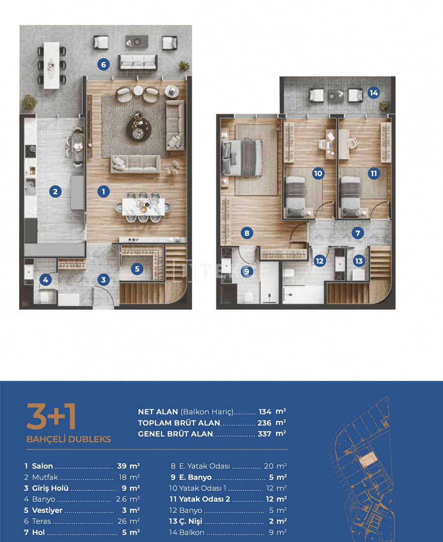 The apartments with views of the Gulf of İzmir are located in a prestigious complex. The project offers amenities like a children’s swimming pool, fitness, outdoor swimming pool, sauna, SPA, playgrounds, communal garden, sunbathing areas, a social club, walking and running trails, dining and conference halls, reception service, 24/7 security service, security cameras, and indoor parking.