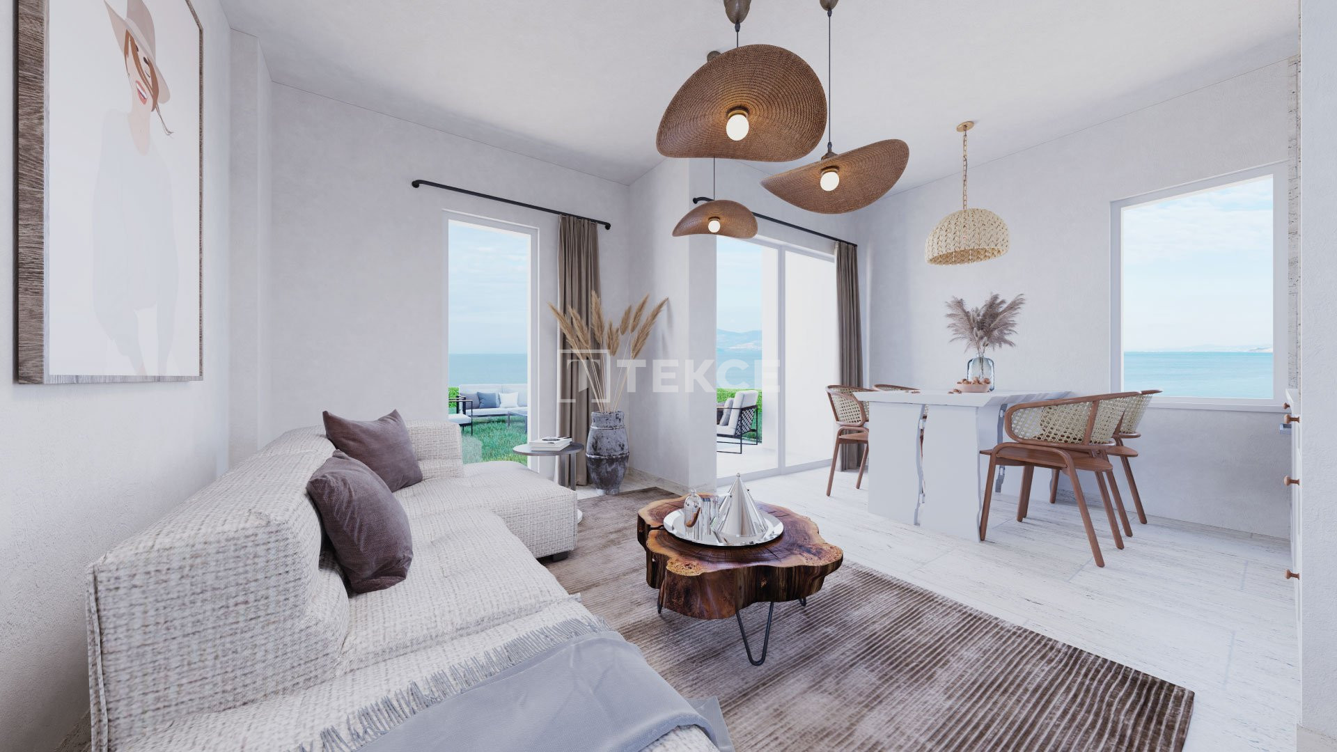 1 bedroom sea view apartment has a private garden, steel door, balcony, shower cabin, central satellite system, PVC window system, and kitchen appliances.