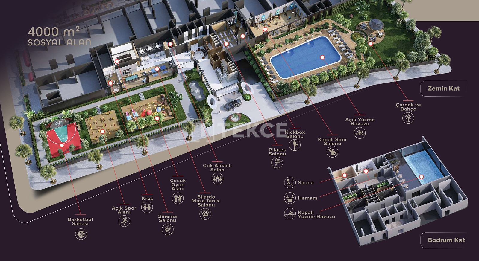 The project consists of 70 privileged flats built on a 7.000 m² plot. The project has a 4.000 m² landscape area and a 1.500 m² social area. It also consists of a wastewater recycling system, cafes and restaurants, shopping areas, an indoor parking lot with a license plate recognition system, walking areas, an indoor and outdoor swimming pool, Turkish bath, sauna, indoor gym, outdoor sports area, basketball court, game room, children’s playgrounds, pilates and kickboxing room, movie theater, reception services, on-site cafe, 24/7 security and security cameras, gazebo and recreational areas in the garden.