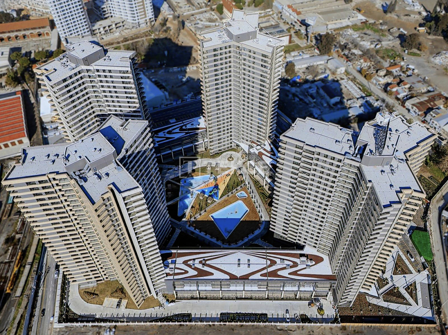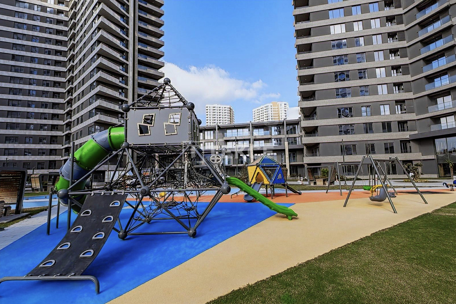 The residential complex is situated on 86.000 m² plots of land. The complex offers 24/7 security, security cameras, indoor and outdoor parking, a gym, SPA, sauna, Turkish bath, cinema, walking trails, playground and game areas, indoor and outdoor swimming pools, janitor service, cafe, restaurant, market, and commercial properties.