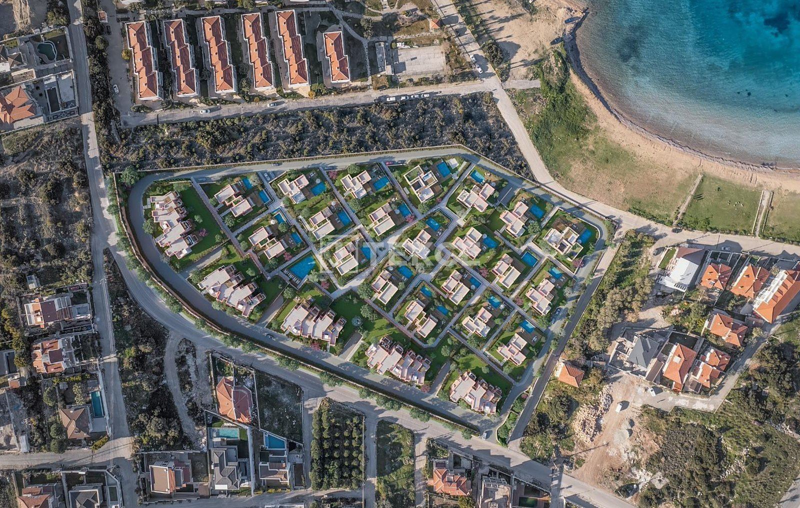 The villa complex is situated on a total land of 23.000 m² and offers 24 detached villas with private swimming pools and gardens. The complex is enriched with indoor and outdoor parking spaces, a communal swimming pool, sports areas, communal activity areas, a playground, a Turkish bath, a sauna, a SPA, a generator, a water tank, 24/7 security, and security cameras.